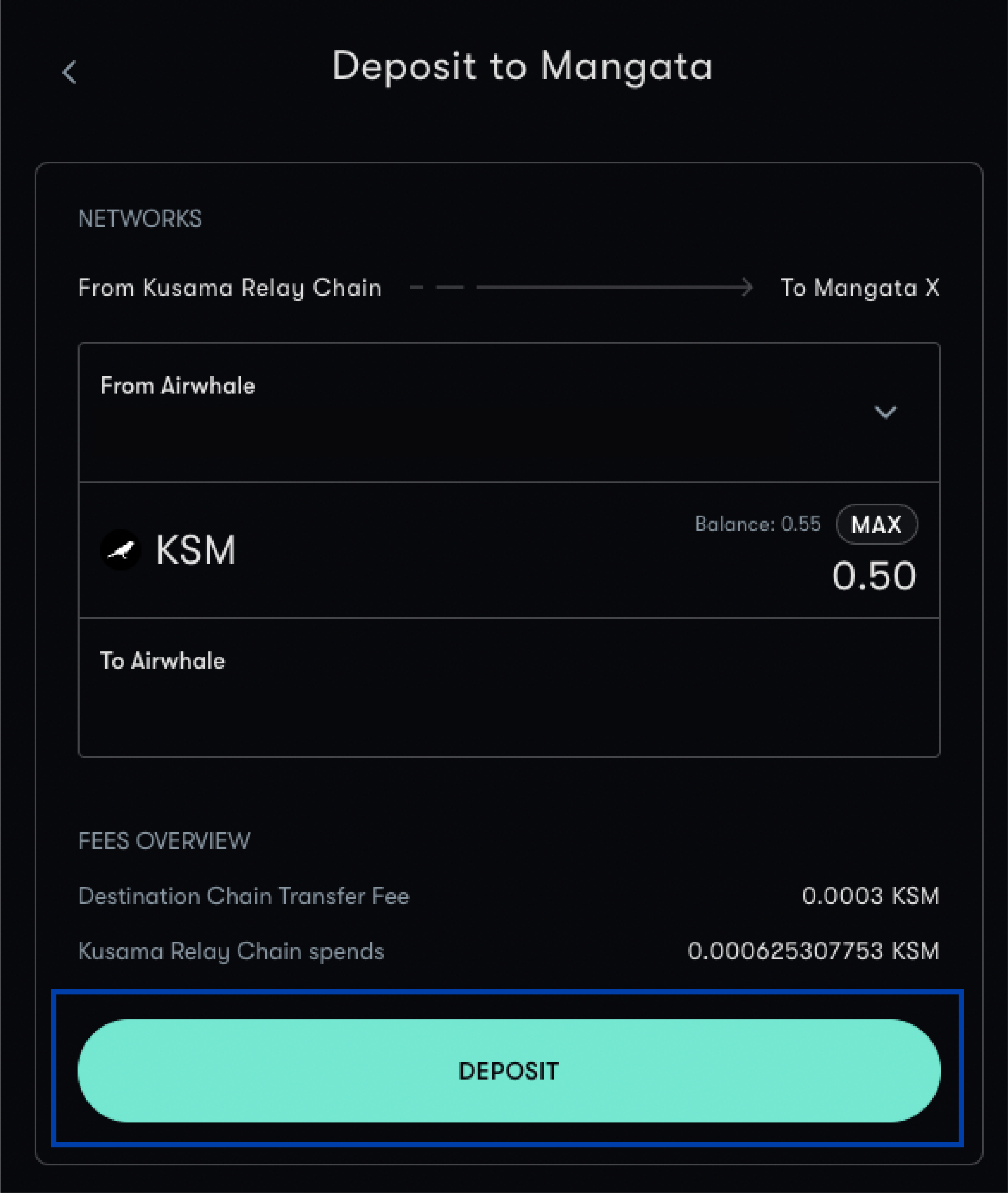 This guide will show you how to deposit tokens on the Mangata X testnet. This example will use KSM. If you don't have KSM, use one of the bridges or use this guide to [deposit KSM from a centralized exchange](https://docs.mangata.finance/welcome/guides/onboarding/from-a-centralized-exchange).